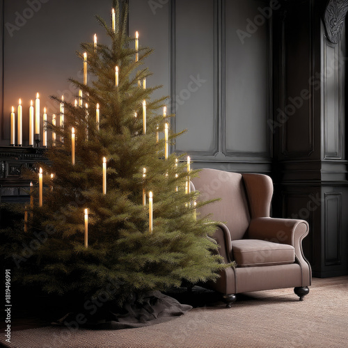 Naklejka premium Christmas tree with glowing candles beside classic armchair in elegant dark living room, cozy and festive holiday atmosphere