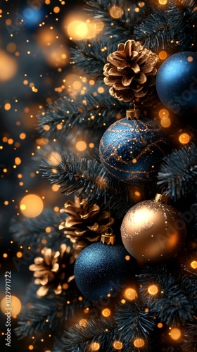 Fototapeta premium Christmas tree with golden baubles, fir cones and lights bokeh background. Space for text. Copy space. Greeting card.