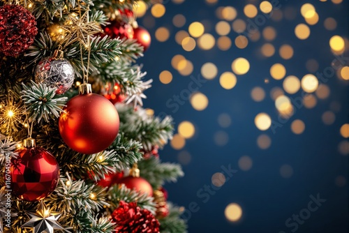 Fototapeta premium Christmas tree with red, silver, and gold ornaments, blurred golden light bokeh on dark blue background, concept of festive holiday decor. Ai generative