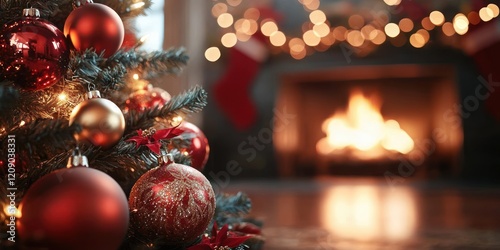 © k, Fototapeta premium Christmas Tree with Warm Fireplace Background Cozy Home Decor Festive Celebration
