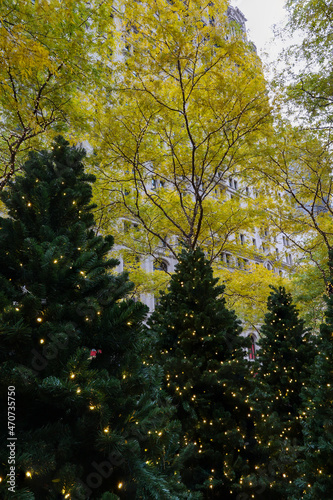 Naklejka premium Christmas trees under yellow trees in New York City