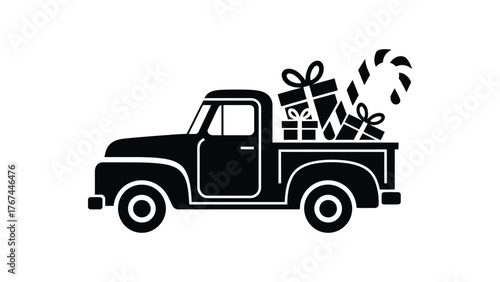 © Faruk-raj, Fototapeta premium Christmas Truck Vector Illustration ? Vintage Pickup Carrying Gifts and Candy Canes Silhouette Holiday Design Isolated on White Background