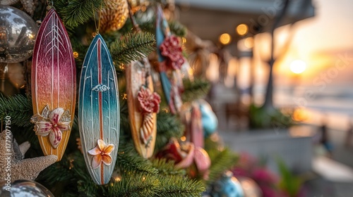 © Ai7, Fototapeta premium christmas vacation on the beach concept. Decorated Christmas tree with surfboards and sunset background.