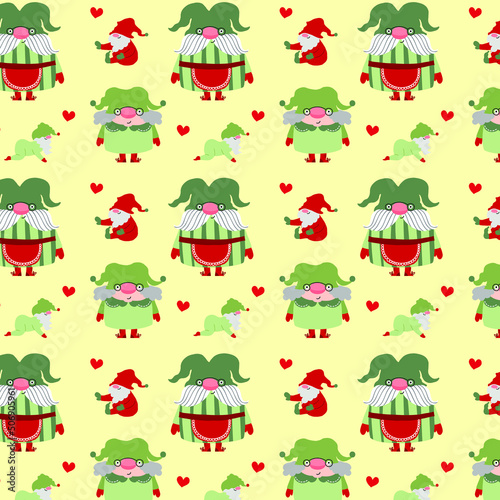 © aliaross, Obraz premium Christmas vector gnomes pattern. Cartoon background with gnomes and hearts.