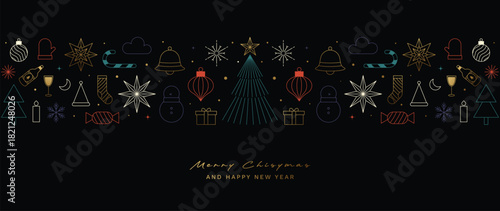 Fototapeta premium Christmas vector greeting card illustration with black background, colorful holiday icons and stars for Happy New Year — playful festive design