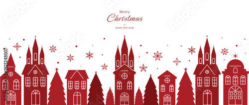 Naklejka premium Christmas vector greeting card illustration with red and white village scene, trees and stars for Happy New Year — classic winter design