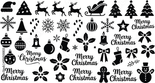 Naklejka premium Christmas vector icon set: decorations, reindeer, snowman, santa, text.