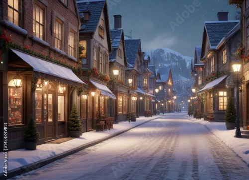 Fototapeta premium Christmas village scene with shops and snow-covered streets, window, decoration
