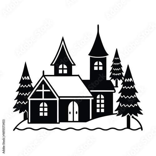 © misttahmina, Obraz premium christmas village silhouette vector art on white background