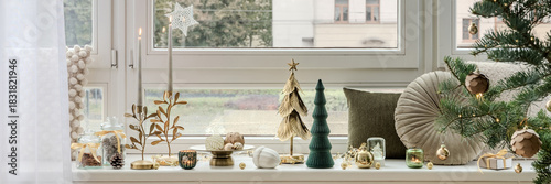 © Photo, Obraz premium Christmas window sill with candles, trees and ornaments in gold and green. Cozy and natural festive arrangement with soft daylight.
