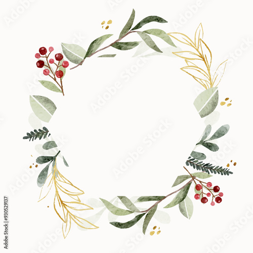© HalfPastTwo, Naklejka premium Christmas Winter Floral Wreath Frames Red and Green Plant in Watercolor Style