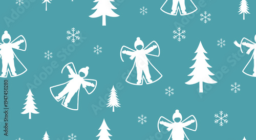 Obraz premium Christmas Winter Holiday Flat Seamless Pattern with Snow Angels, Trees, and...
