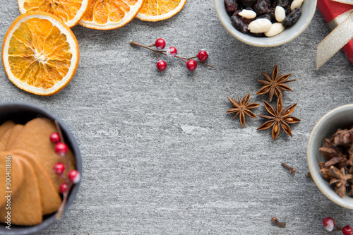 © Syda Productions, Fototapeta premium christmas, winter holidays and seasonal drinks concept - hot mulled wine, dry orange slices, raisins with pine cones and aromatic spices on grey background