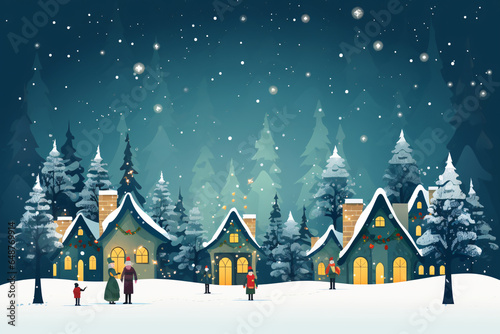 Fototapeta premium Christmas winter night landscape with snowy pine trees, houses and people....