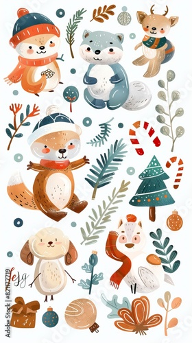 Naklejka premium Christmas winter stickers collection for kids, seasonal design, cute animals...