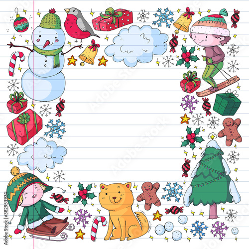 Fototapeta premium Christmas winter vector background with children. Kids vacation and sport.