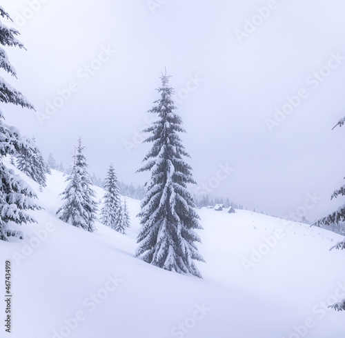 © Vitalii_Mamchuk, Naklejka premium Christmas wonderland. Winter landscape. Magical forest. Meadow covered with frost trees in the snowdrifts. Snowy wallpaper background.