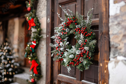 © Duckai, Fototapeta premium Christmas Wreath hanging on house door as festive decoration with red bows and balls celebrating family traditions during holiday season