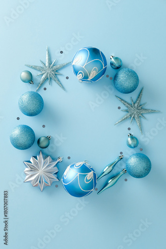 Fototapeta premium Christmas wreath made of blue baubles and stars on pastel blue background