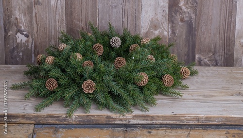 Obraz premium Christmas wreath made of pine cones and evergreen branches, seasonal decor for festive celebrations