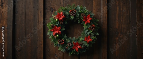 Naklejka premium Christmas wreath on a rustic wooden door for holiday decorations.