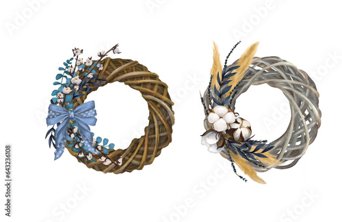 Obraz premium Christmas wreath set. watercolor composition of a bow knot, cotton and dried...