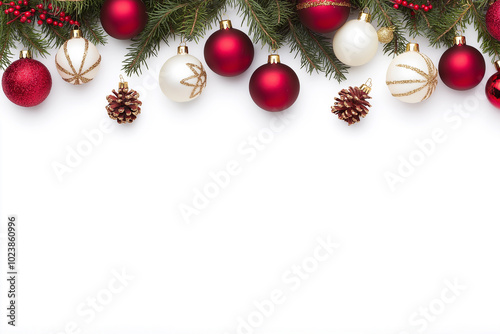 © iamfrk7, Fototapeta premium Christmas wreath with poinsettia flowers, ornaments, and greenery on white background. Perfect for holiday decor, festive designs, and seasonal celebration imagery.