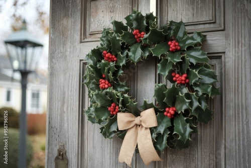 Fototapeta premium Christmas wreath with red berries and a golden ribbon on a wooden grey door, holiday decoration in winter setting, festive season concept
