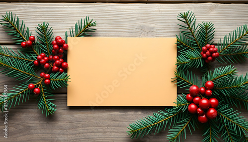 Obraz premium Christmas 7x5 card mockup template on natural fir twigs on wooden background....
