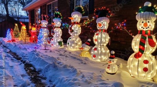 © Sumet, Obraz premium Christmas yard display with lighted figures, snowmen, and a cheerful holiday atmosphere