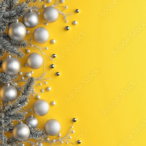 © Mereke, Fototapeta premium Christmas yellow background with Christmas balls and gray decorations