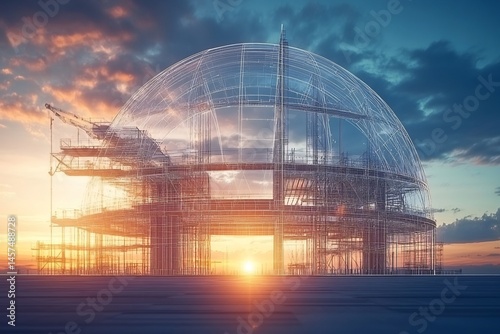 © Premium Stock , Obraz premium Chromatic cupola structure illustration showcasing classic roof passive house and a delicate technical drawing sketch plan in angled sunset light