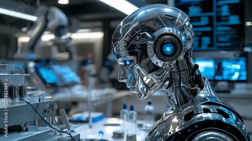 Fototapeta premium Chrome robot in futuristic lab setting.