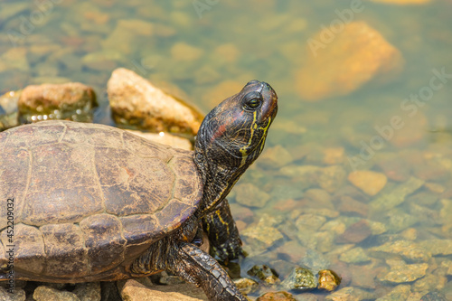 Fototapeta premium Chrysemys Picta, or painted turtle, in Singapore Botanic Gardens