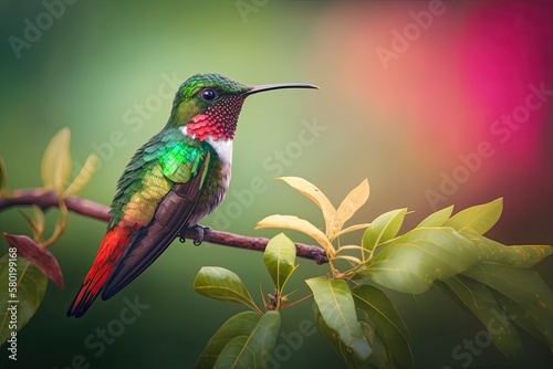 Fototapeta premium Chrysolampis mosquitus, or the ruby topaz hummingbird, is a little, colorful bird. Fluttering hummingbird against a hazy green background. View of wild animals in their natural habitat. Observing bird