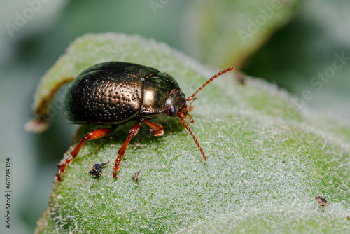 © Jorge, Fototapeta premium Chrysolina bankii leaf beetle walking on a green leaf on a sunny day