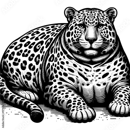 © Oleksandr Pokusai, Fototapeta premium chubby fat leopard with bold spots, combining humor and retro artistic style sketch engraving generative ai PNG illustration. Scratch board imitation. Black and white image.