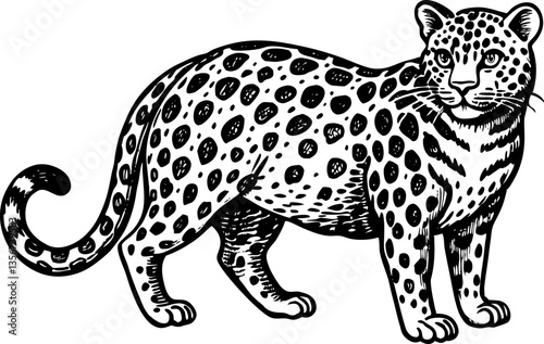 Fototapeta premium Chubby fat leopard with bold spots, combining humor and retro artistic style sketch engraving vector