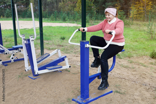 Fototapeta premium Chubby joyful girl performs sports exercises on street simulators