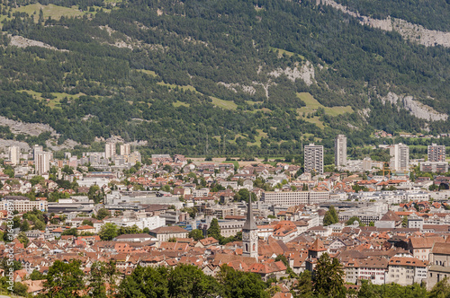 © bill_17, Fototapeta premium Chur, Stadt, Altstadt, Martinskirche, Kirche, Altstadthäuser, Hochhäuser, Alpen, Schweizer Berge, Graubünden, Sommer, Schweiz