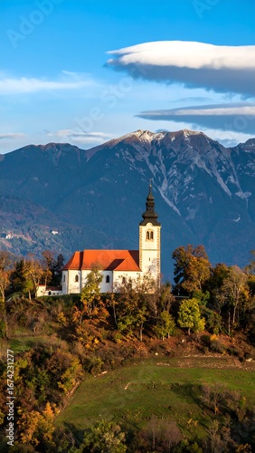 © Kabel, Fototapeta premium Church atop a hill, autumnal landscape