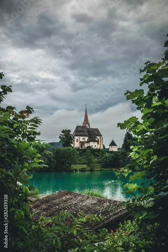 © Maximilian, Fototapeta premium Church of Maria Worth at Lake Woerthersee near Velden in Austria during Summer