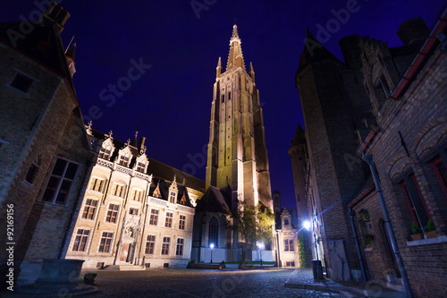 © Sergey Novikov, Fototapeta premium Church of Our Lady Bruges from cobblestone road