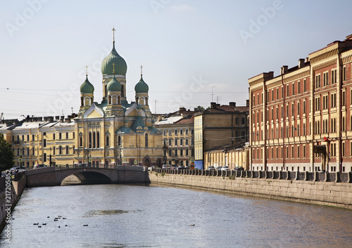 © Andrey Shevchenko, Naklejka premium Church of St. Isidore and Mogilev bridge over Griboedov canal in Saint Petersburg. Russia