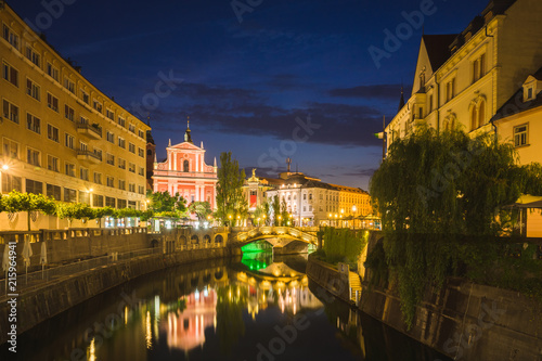 Obraz premium Church of the Annunciation and Lublanica river at night in Ljubljana, Slovenia