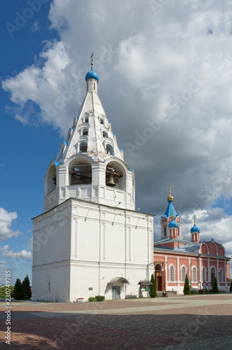 Obraz premium Church of the Mother of God Tikhvin and the bell tower of the Assumption Cathedral on the Cathedral square of the Kolomna Kremlin. Kolomna, Moscow region, Russia