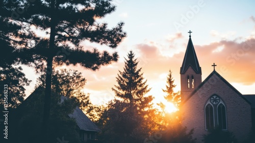 © Big9869, Fototapeta premium Church Silhouette at Sunset with Trees.