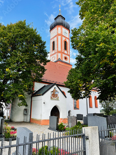 © AS Photo Family, Naklejka premium Church St. Sebastian Puch in Furstenfeldbruck, Germany with red roof clock tower, surrounded by trees and graveyard, historic architecture