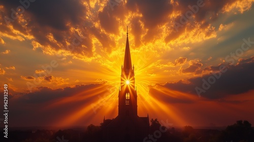 © Chutikarn, Obraz premium Church Steeple Silhouette at Sunset with Radiant Sunburst