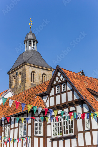 Fototapeta premium Church tower and half timbered houses in Tecklenburg